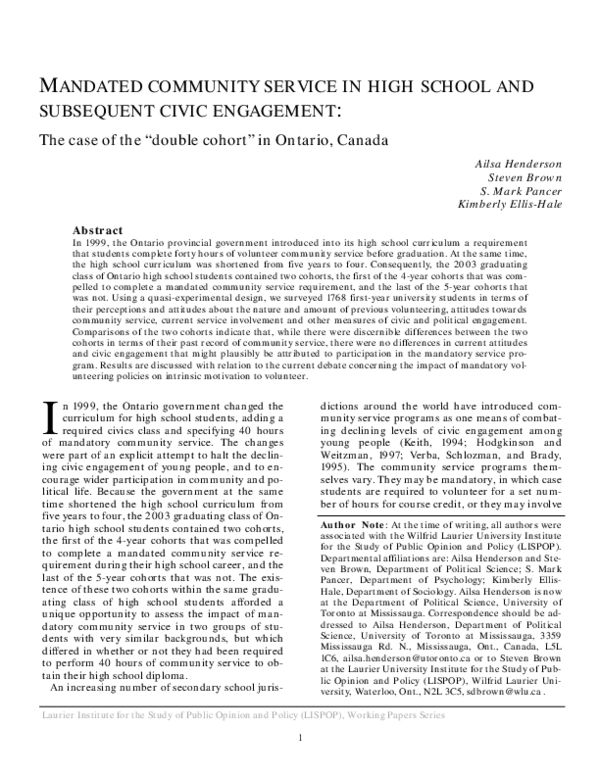 Pdf Mandated Community Service In High School And Subsequent Civic Engagement The Case Of The Double Cohort In Ontario Canada Mark Pancer Academia Edu